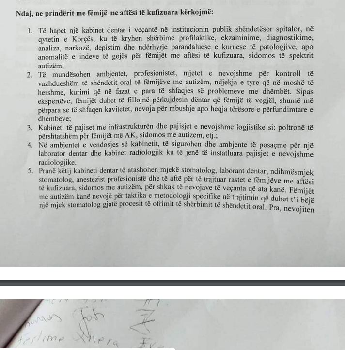 Në një tjetër shkresë, spitali ka premtuar se do të kërkojë në vazhdimësi pranë Ministrisë së Shëndetësisë mundësinë e çeljes së një Kabineti të Specializuar për shërbimin oral për fëmijët me aftësi ndryshe, për kryerjen e shërbimeve falas, me aparaturat përkatëse dhe mjek të specializuar.