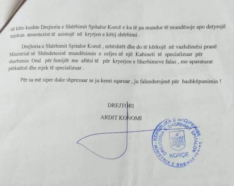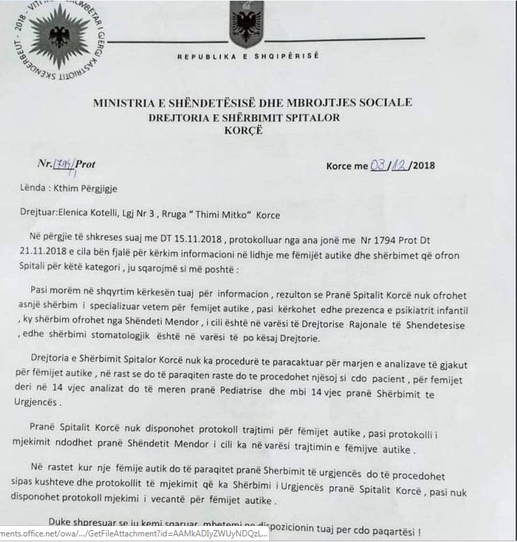 Shkresë drejtuar Drejtorit të Spitalit të Korçës, e për dijeni Ministres së Shëndetësisë, Ogerta Manastirliu