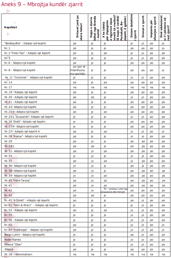 38 kopshte (nga të cilat 24 kopshte janë të nismës “Adopto një kopsht”) i kanë dyert që hapen në drejtimin “brenda – jashtë”, duke vështirësuar daljet sa më emergjente në situatë zjarri.